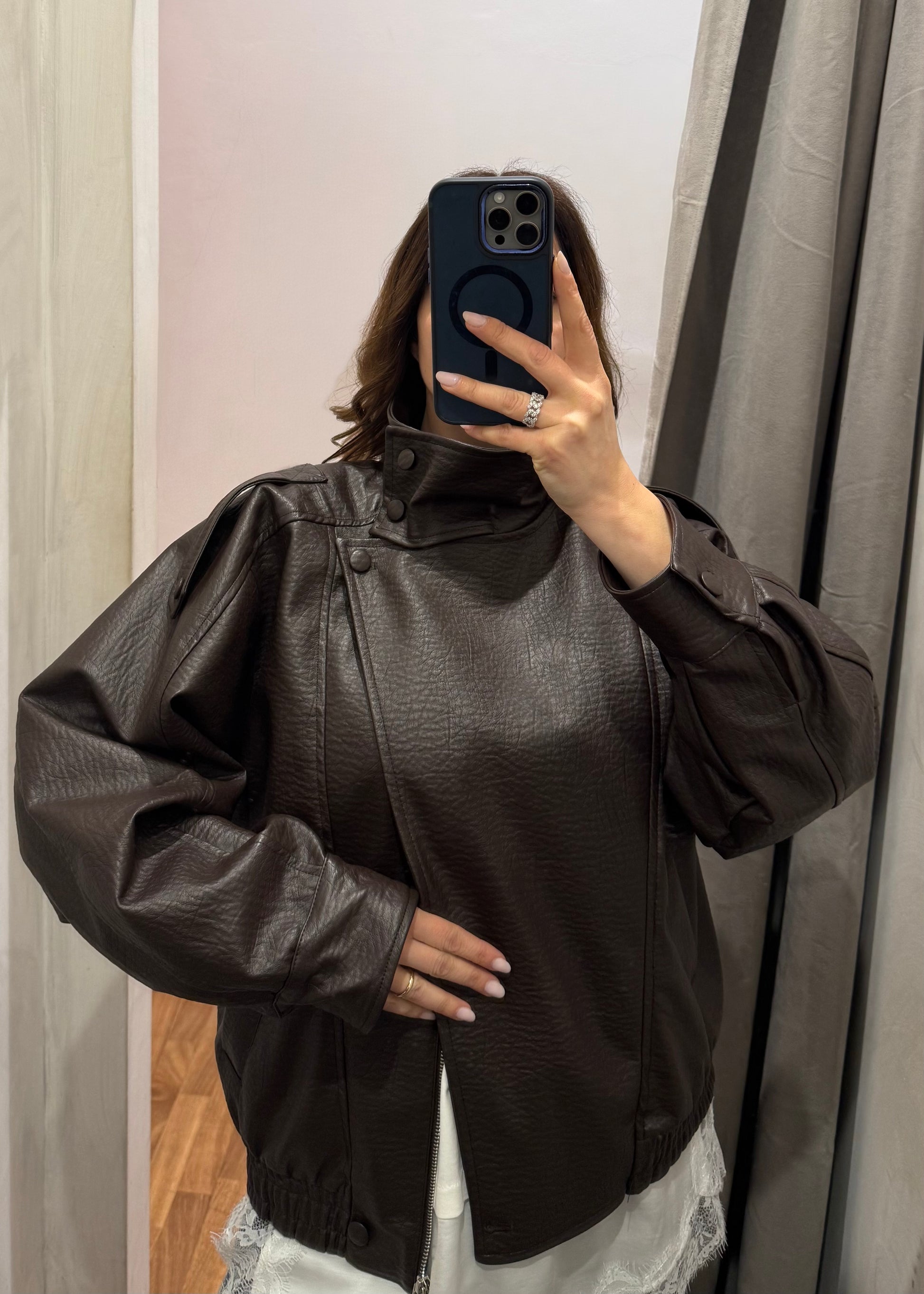 Bomber ecopelle martellata con maxi spalla e colletto alto Susy Mix. Con pattina trasversale e tasche laterali. Fit oversize.
