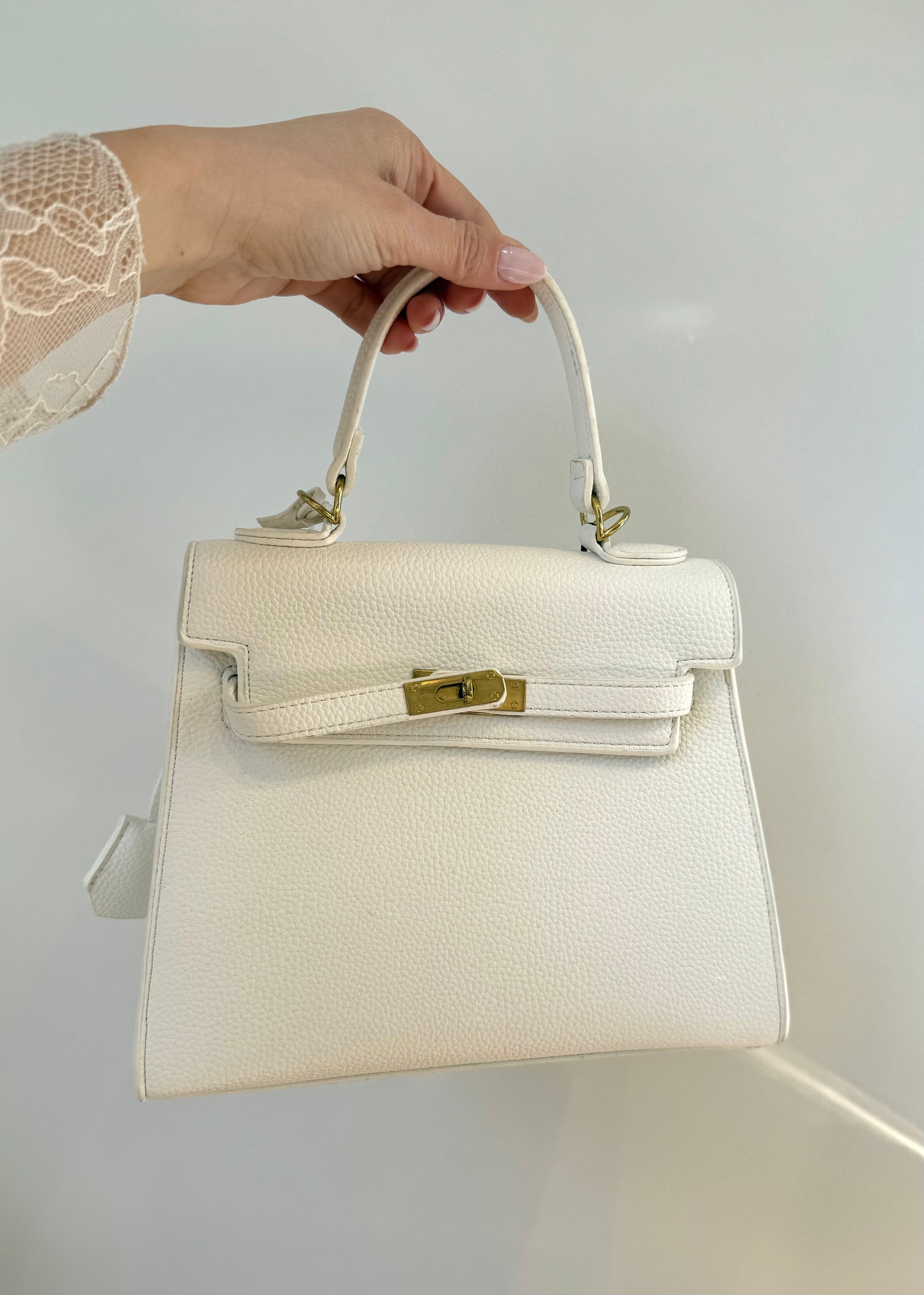 Borsa modello “Kelly” in ecopelle effetto martellato colore bianco. Dotata di tracolla coordinata rimovibile. Misura media.