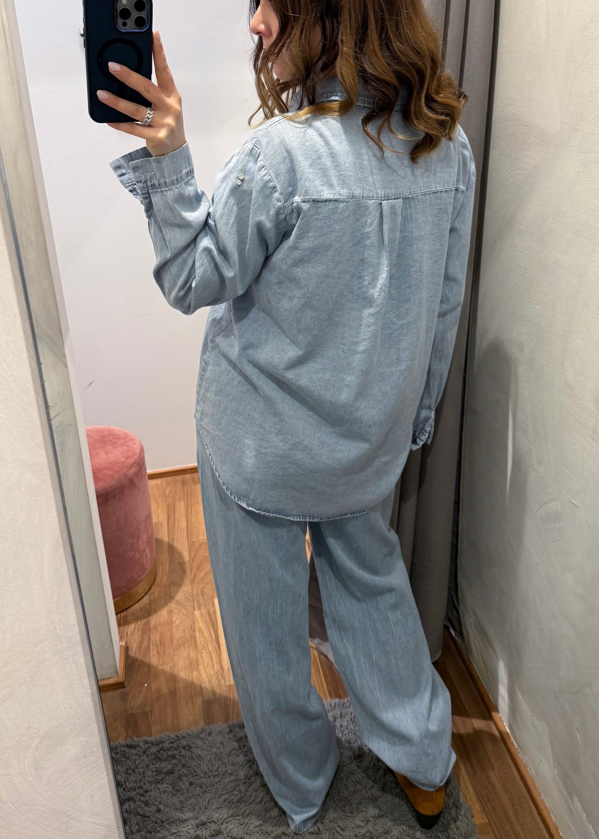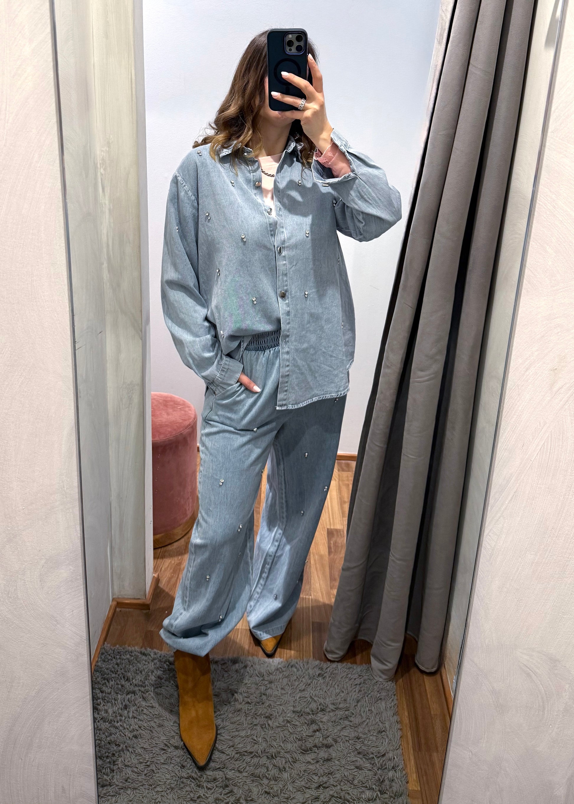 Completo in denim chiaro con applicazioni di strass sulla parte anteriore della camicia e del pantalone. Camicia con colletto classico e bottoni in metallo; pantalone dritto con elastico in vita e tasche. Vestibilità regolare.