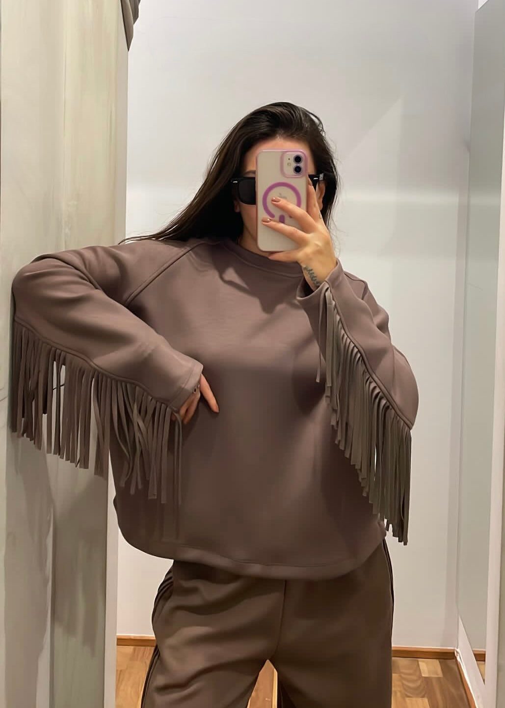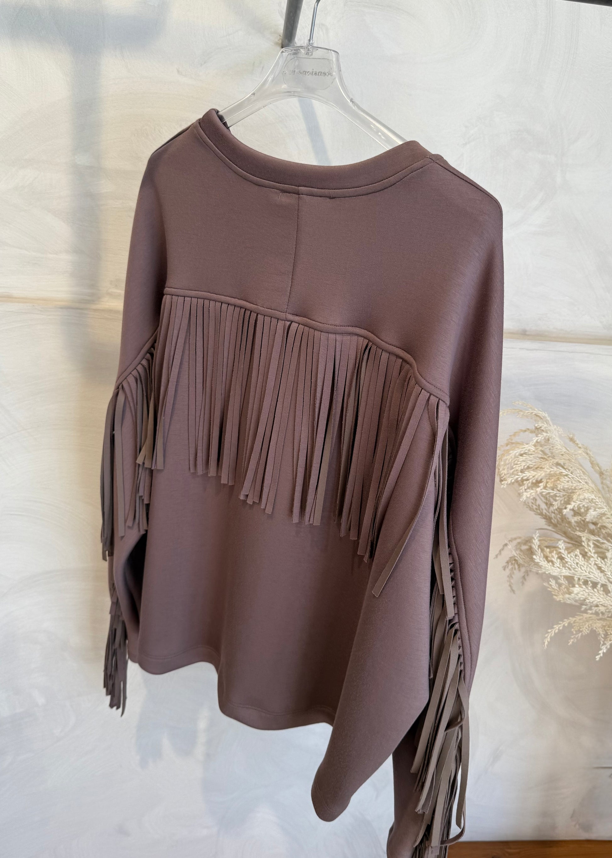 Felpa modello oversize di Lumina, con frange sulla manica e sulla parte dietro della schiena. Tessuto morbido in misto viscosa.
