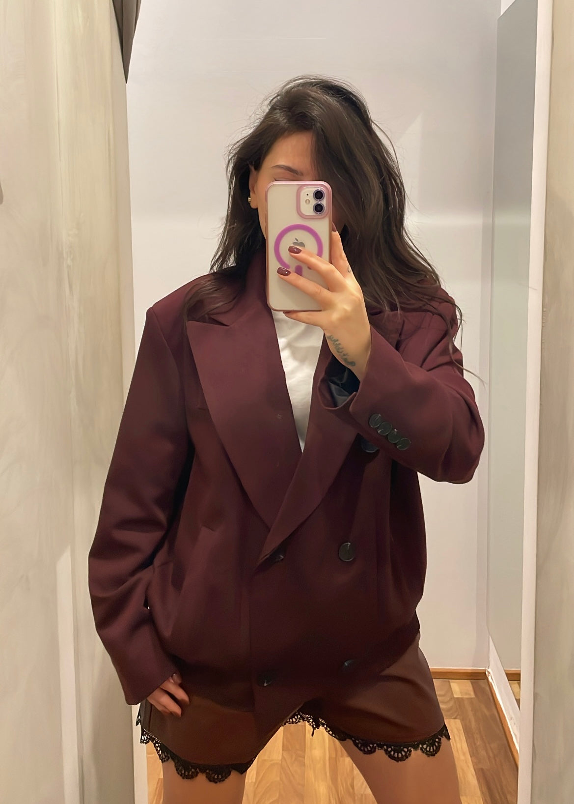 Blazer stile bomber con spalline di Lumina, chiusura doppiopetto con bottoni neri, rivestito internamente, tasche a filo laterali ed elastico sul fondo.