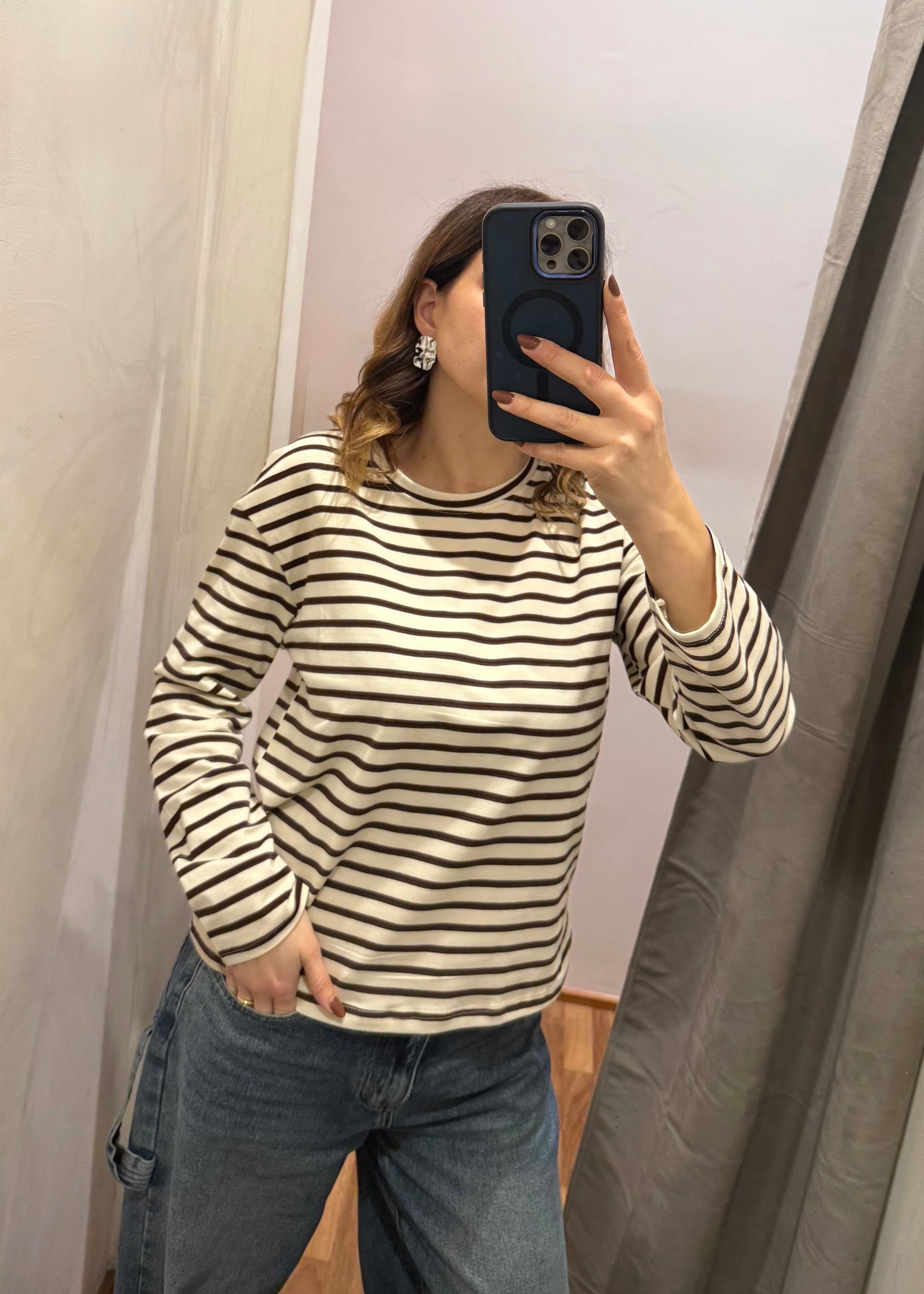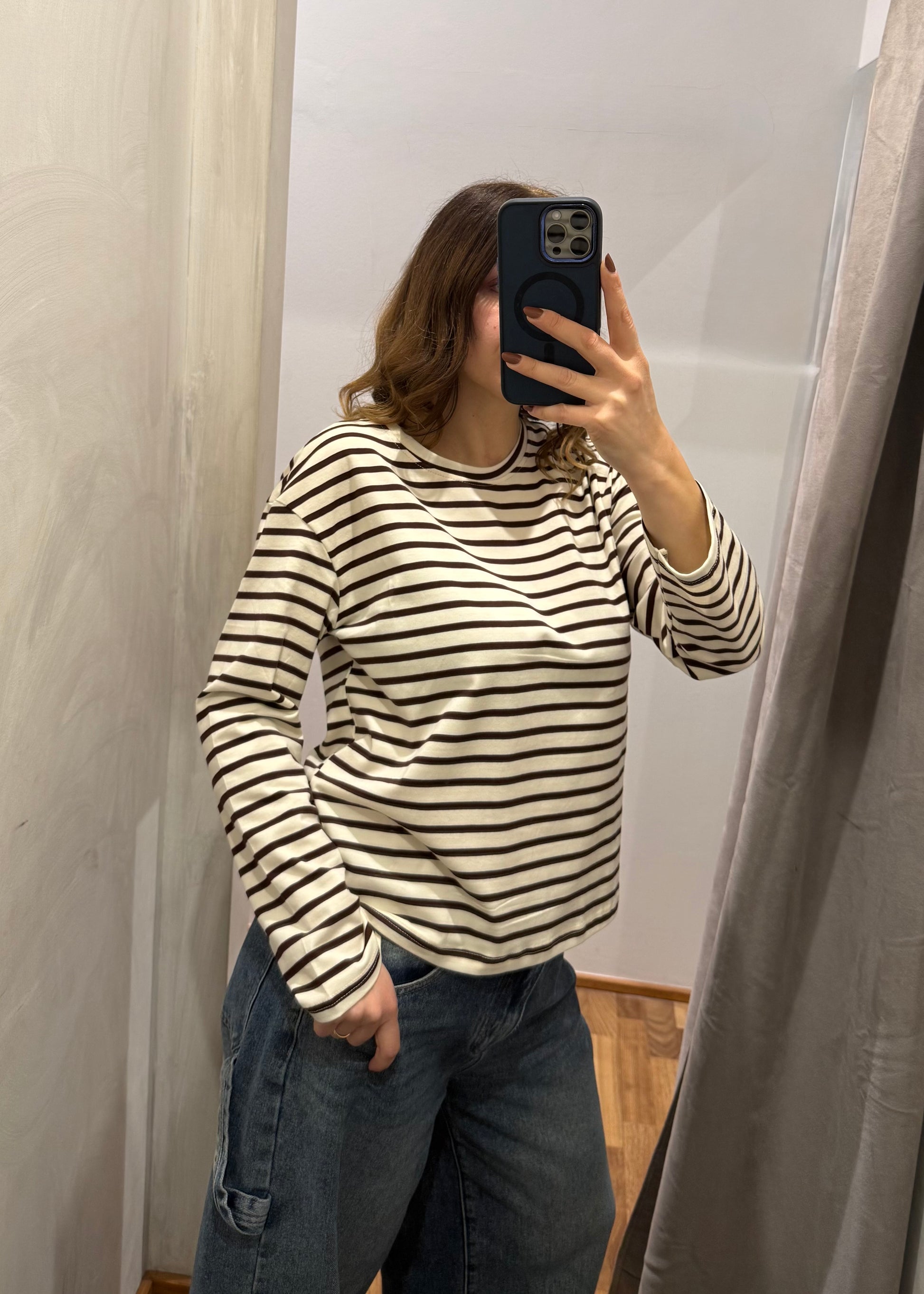 Maglietta in cotone a righe nei toni del panna e moro. Scollo girocollo e maniche lunghe. Vestibilità ampia.