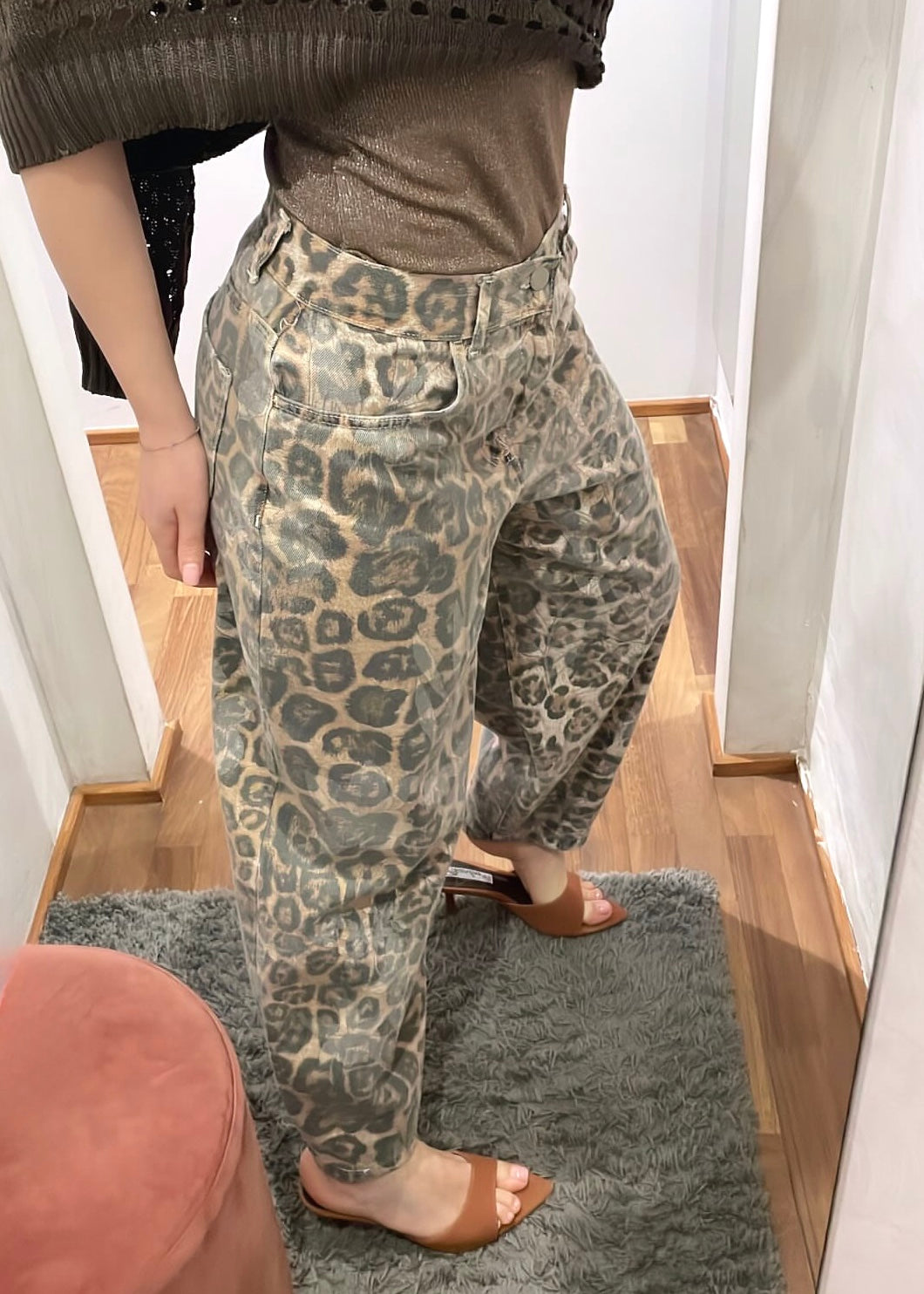 Pantalone ovetto 5 tasche in fantasia animalier leopardata e fiori Susy Mix. Vestibilità regolare.