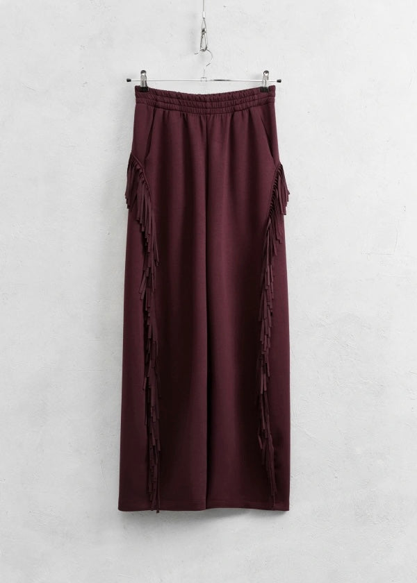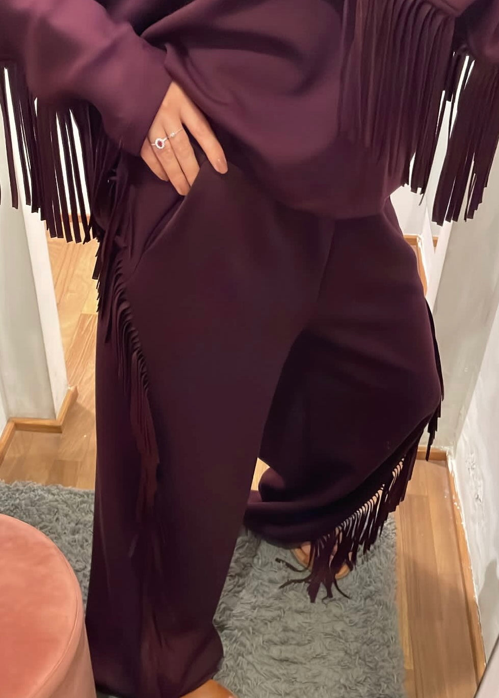 Pantalone ampio. Modello balloon. Con vita elasticizzata.Tasche laterali. Dettaglio frange parte posteriore e parte laterale. Cuciture e rifiniture tono su tono.