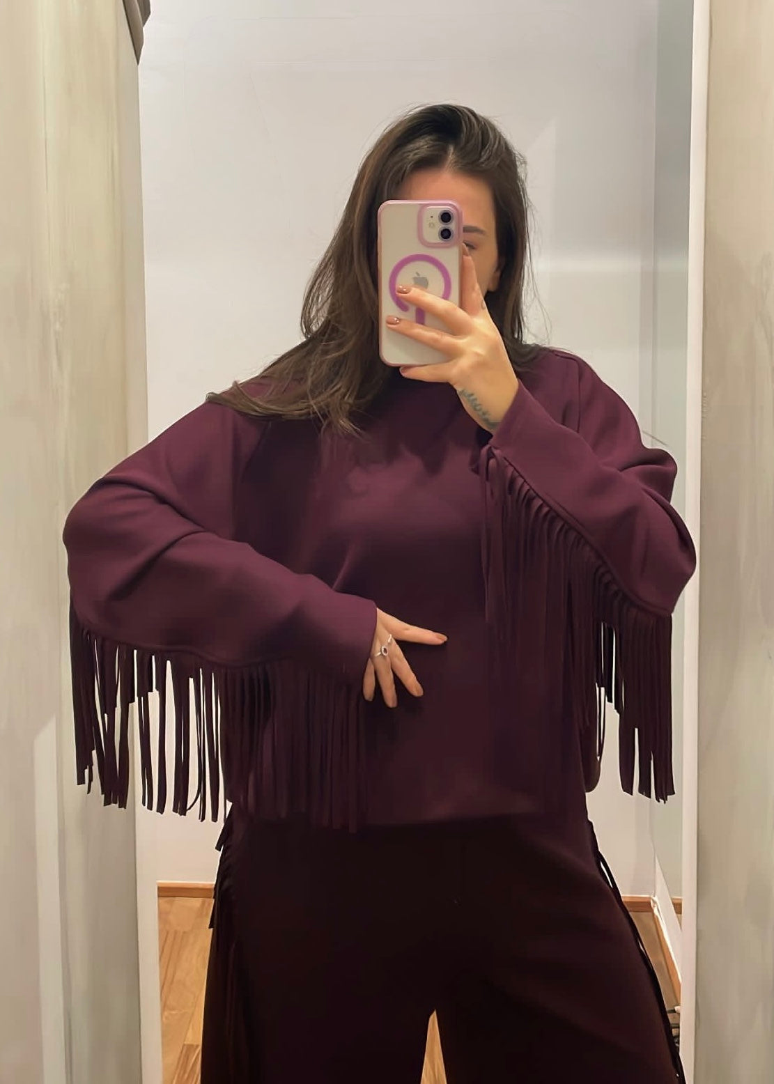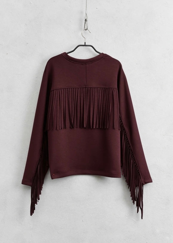 Felpa leggera. Modello oversize. Dettaglio frange parte posteriore. Cuciture e rifiniture tono su tono. Scollo rotondo ampio.