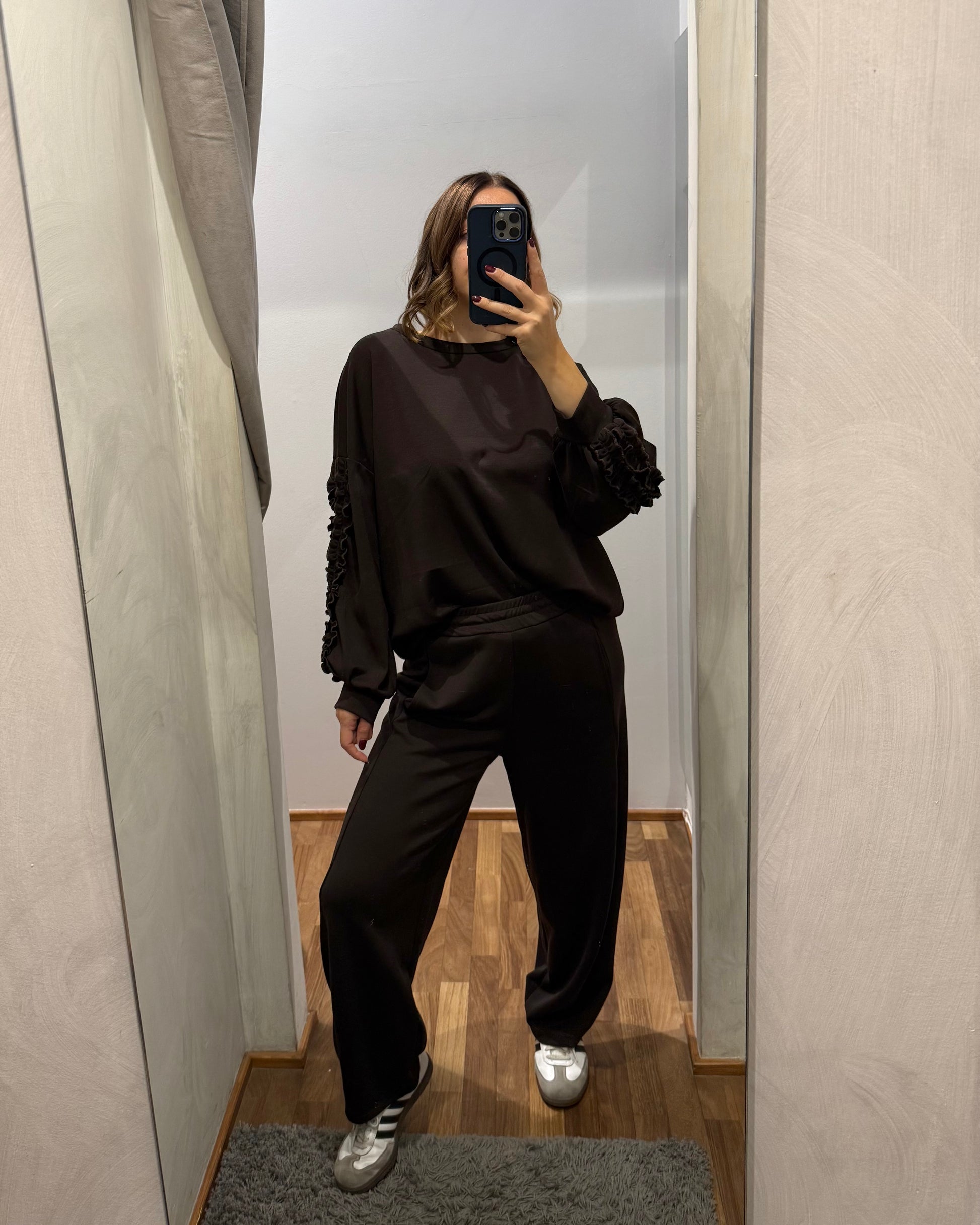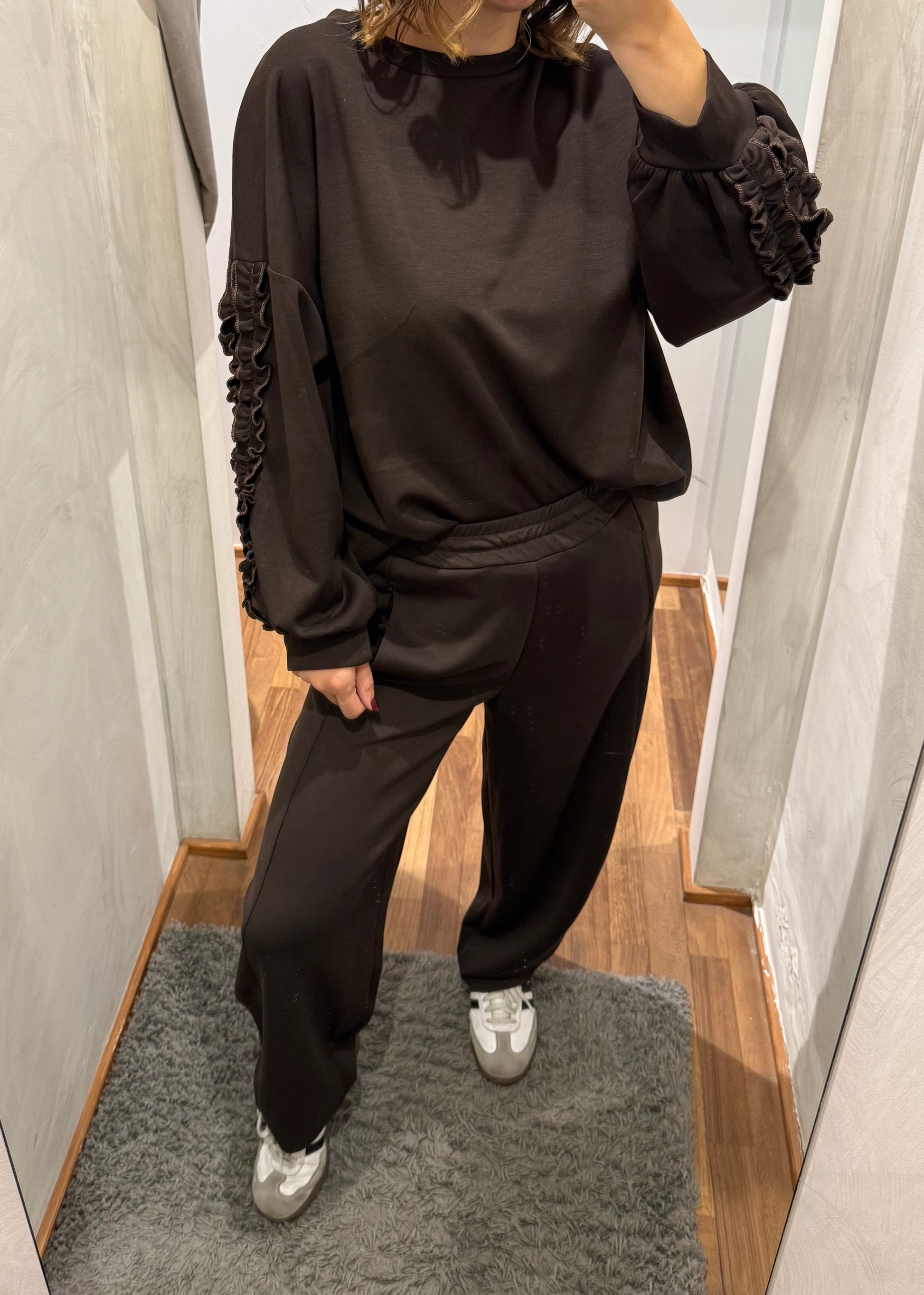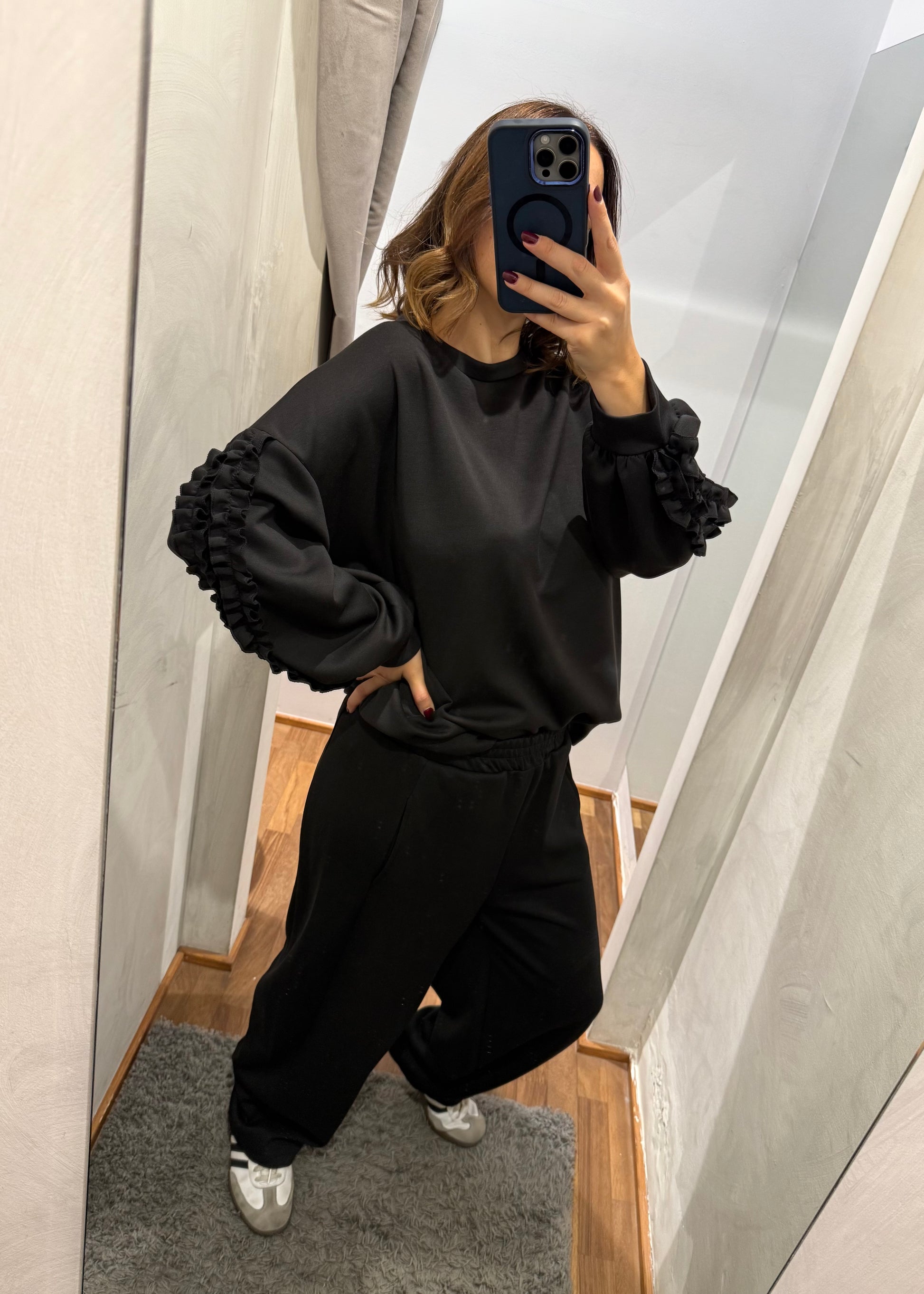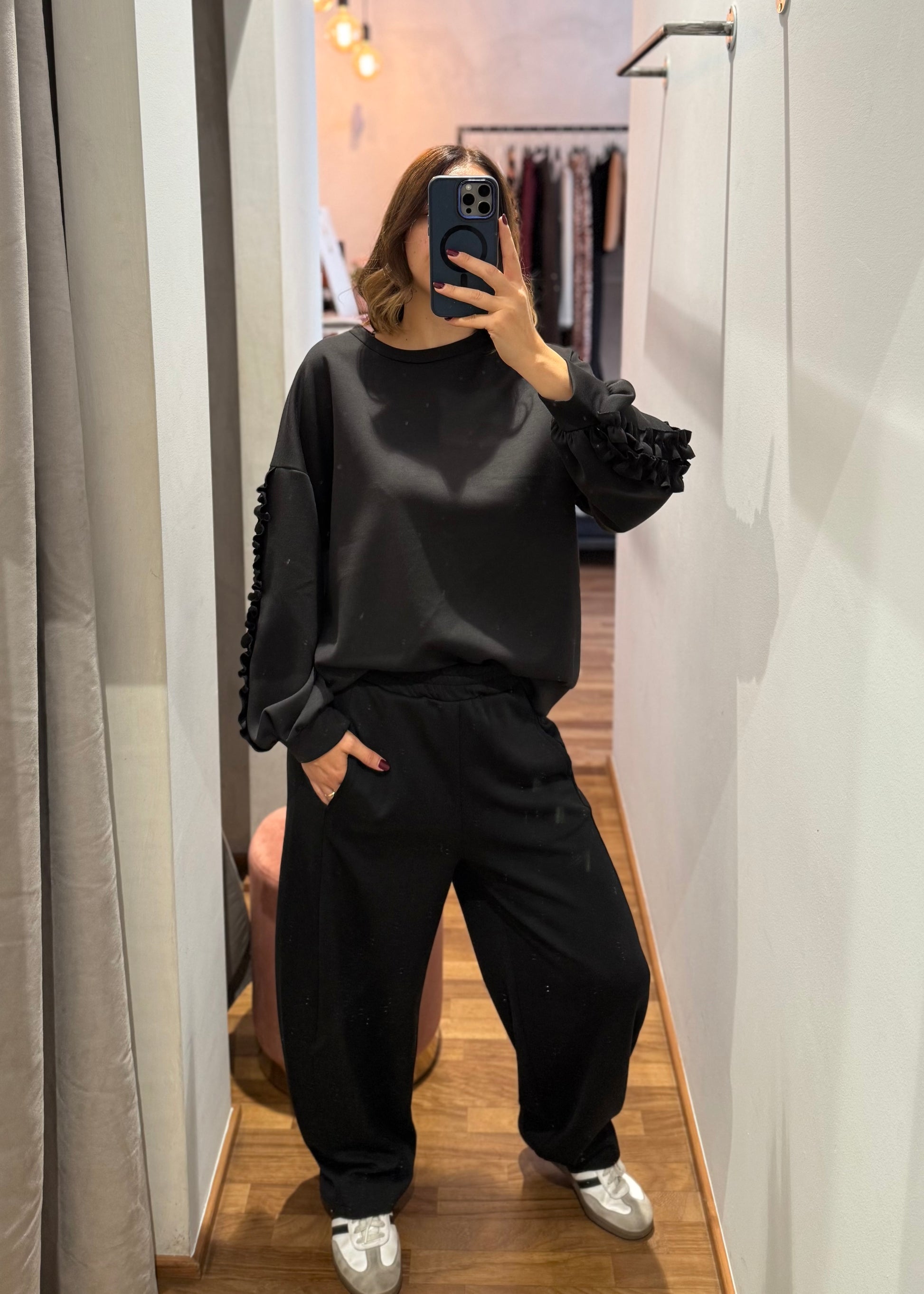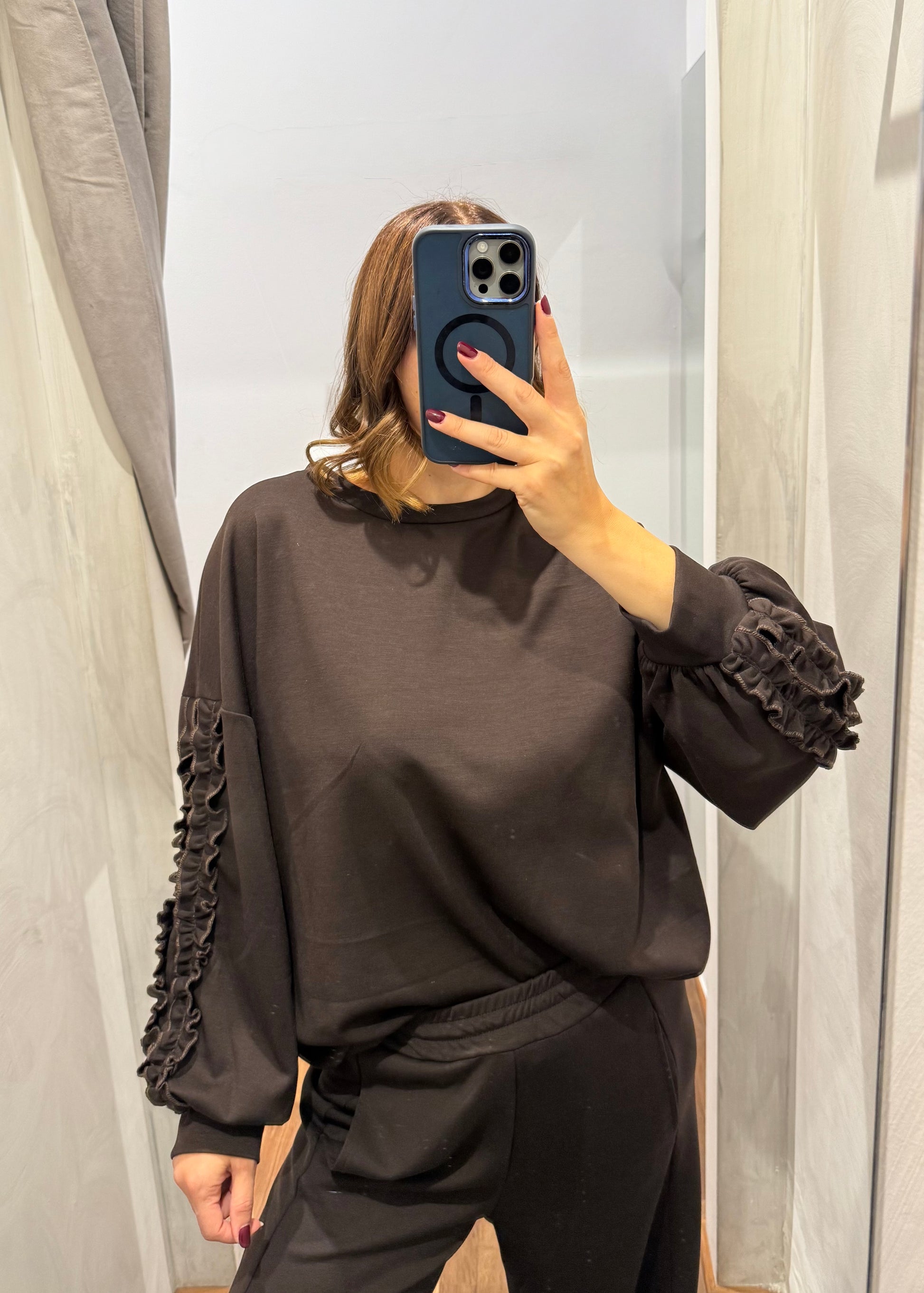 Felpa modello oversize con dettaglio di rouches sulla manica.