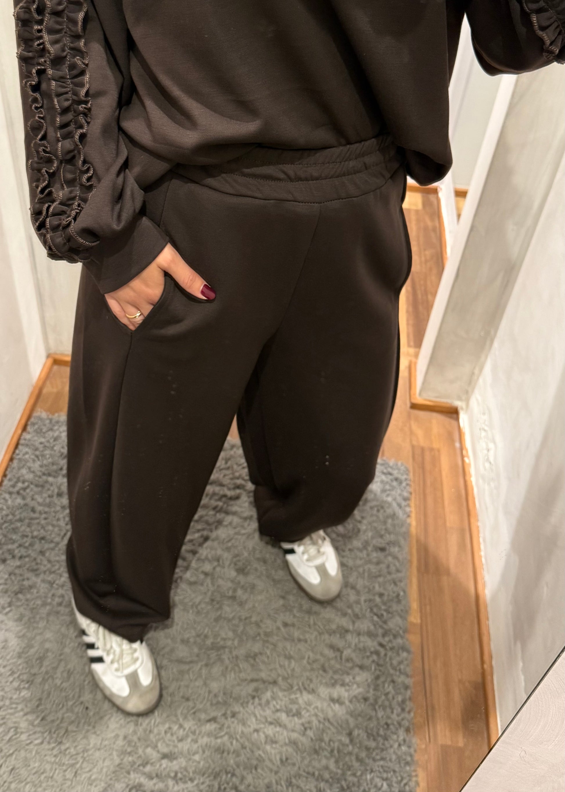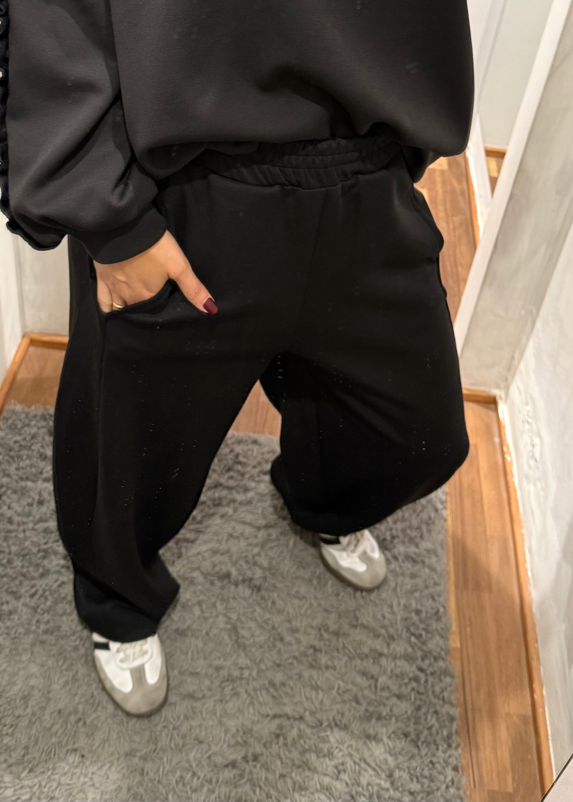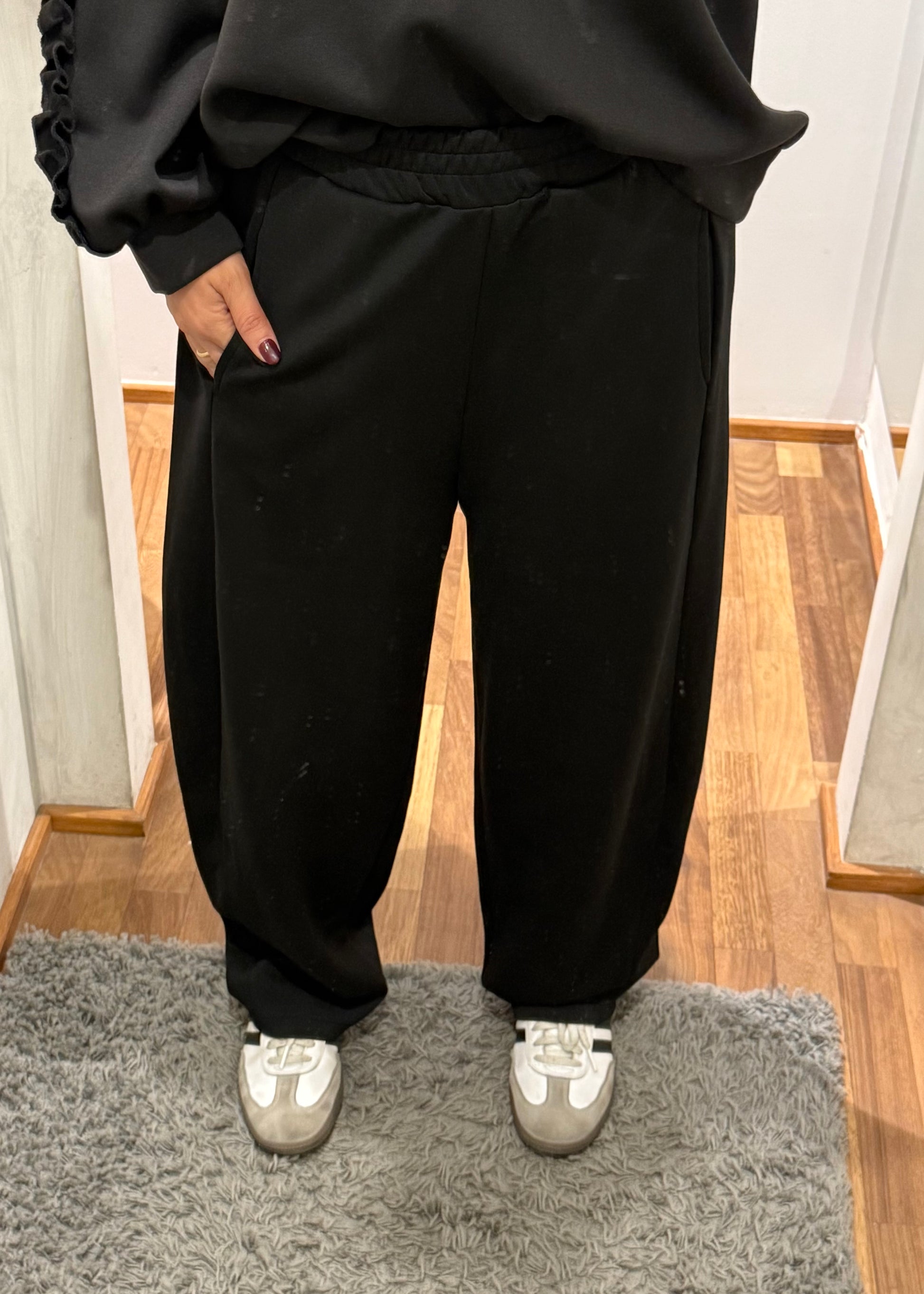 Pantalone modello balloon con vita elasticizzata. Vestibilità regolare.